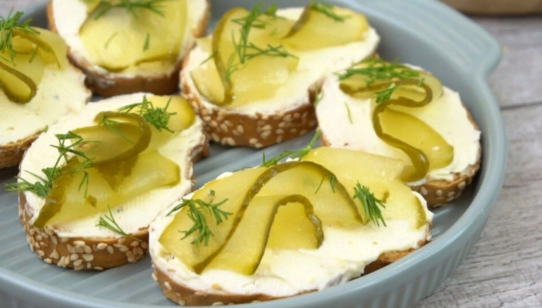 Можно смазывать свежий багет, подсушенный в духовке или на сковороде. Сверху положить свежие огурчики и украсить зеленью.