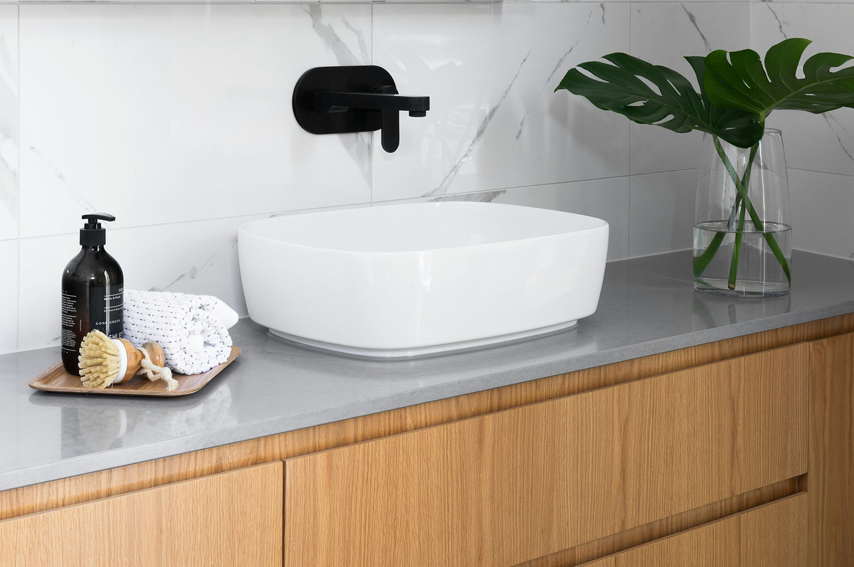 - Столешницы под накладные раковины. Они доступны в различных размерах и не требуют врезки, что упрощает монтаж сантехники.
