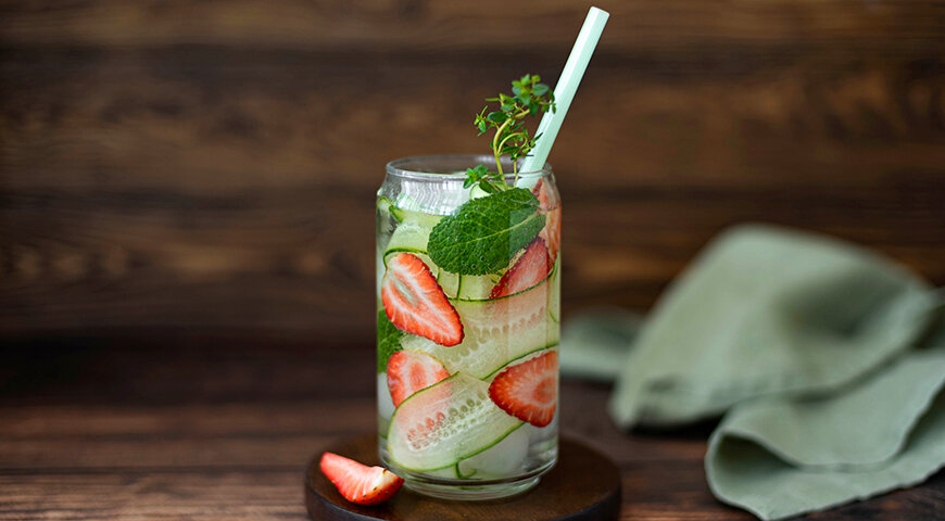 Положите в кувшин один хороший сочный огурец и залейте водой. Если резать тонкими ломтиками с кожурой, напиток становится ароматнее и насыщеннее по вкусу — не нужно искать добавок.