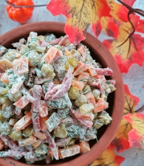 Яркий и насыщенный салат, приготовленный из простых, но аппетитных ингредиентов. Он станет отличным дополнением как для домашнего ужина, так и для пикника с друзьями. Позвольте себе насладиться этим кулинарным шедевром!