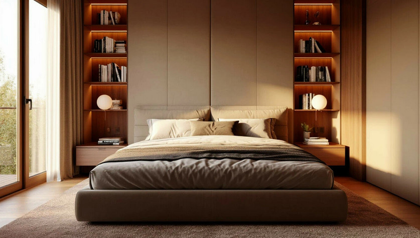Идеальное расположение кровати — изголовьем к стене, позволяющей видеть дверь, но не находиться прямо напротив неё. Этот подход способствует улучшению качества сна и созданию атмосферы защищённости.