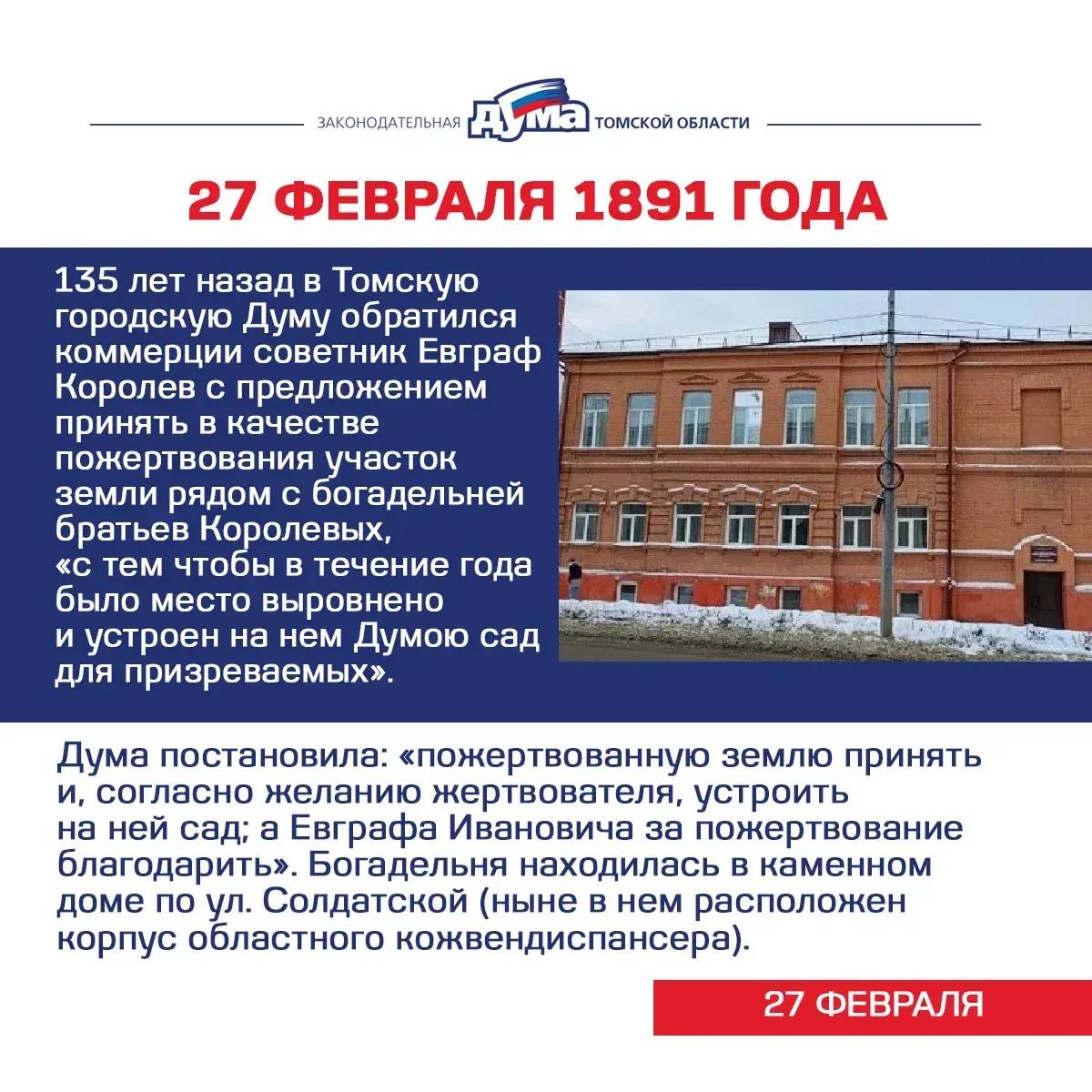 В последнюю февральскую неделю летопись событий из истории томской представительной власти составили инициативы купцов Томска о жертвовании участка земли для устройства сада, издании первой томской частной газеты.