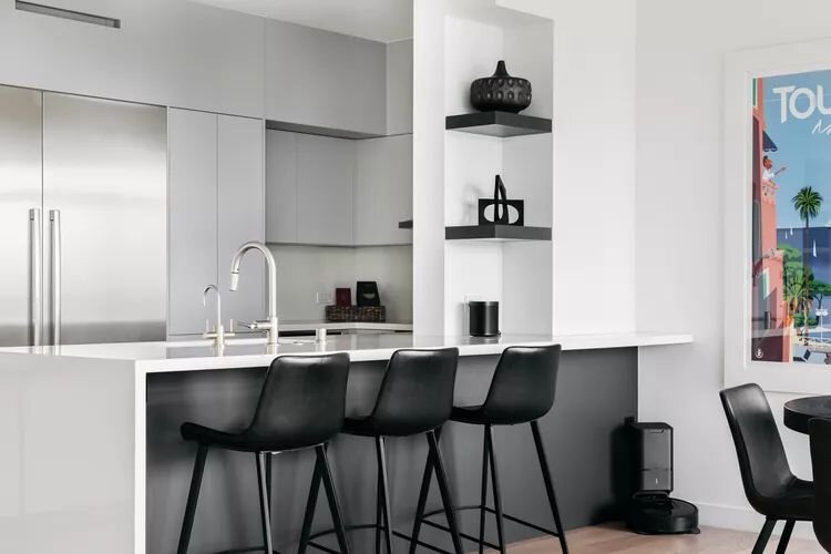 - Ультрасовременные контрасты: Черно-белая кухня с гладкими поверхностями и тщательно продуманным освещением добавляет интерес и индивидуальность.
