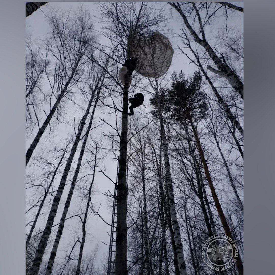 Парашютист застрял на дереве в Томской области.