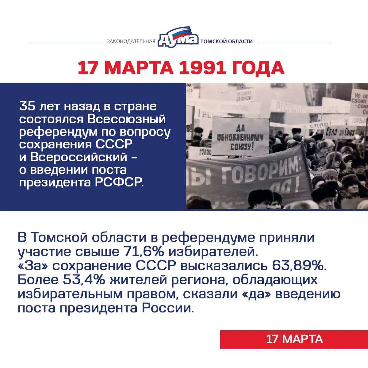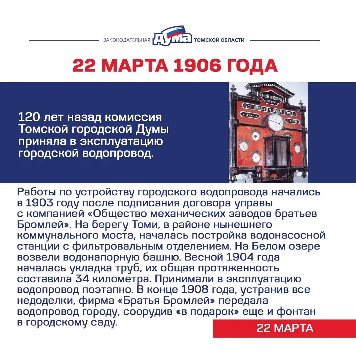 Продолжаем хронику событий из истории представительной власти на территории Томской области. В период с 16 по 22 марта произошли: референдум о сохранении СССР, переизбрание председателя облисполкома, ввод в эксплуатацию первого городского водопровода. Об этих событиях – в наших карточках.