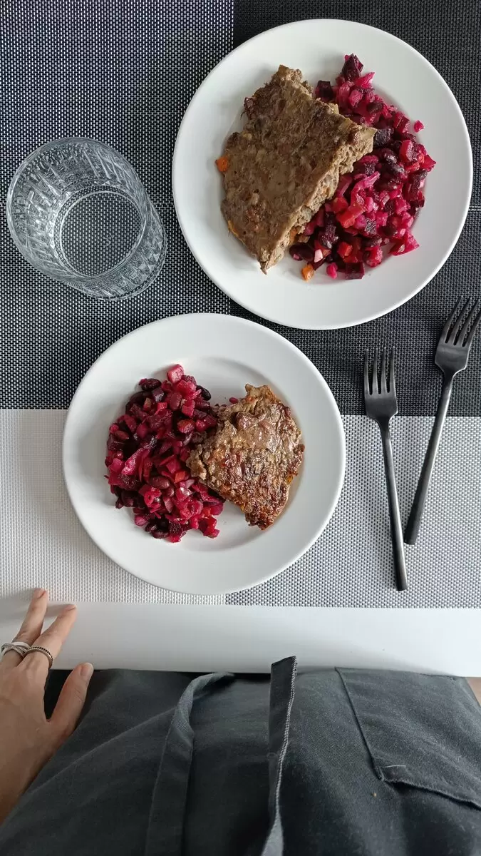 - Обед: Винегрет с добавлением фасоли, мясной «хлеб» и сладкое наслаждение — морковный кекс с грецкими орехами и кокосовым урбечом.