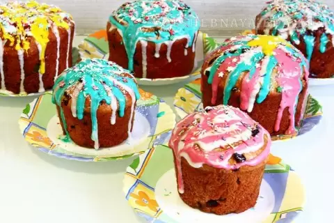 При помощи пакетиков с отрезанными концами глазурь хаотично наносится на куличи, после чего их можно украсить цветными посыпками. Готовые угощения порадуют своими вкусом, ароматом рома и несравненной мягкостью.