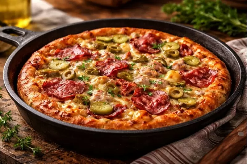 Запекание: В духовке пицца готовится 10-15 минут при 190-200°C, а на сковороде — под крышкой на минимальном огне 10-12 минут.
