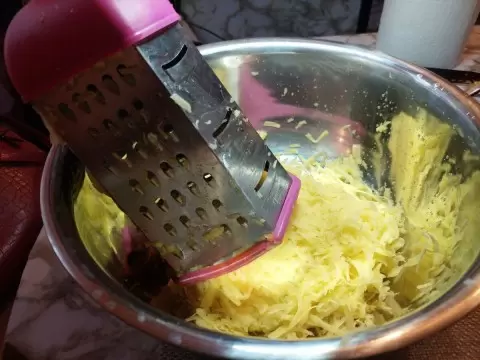 Приготовление начинается с подготовки овощей: картошку и морковь натереть на крупной терке и присолить для выделения сока. Тем временем мелко нарезают лук, который позже добавят в начинку.