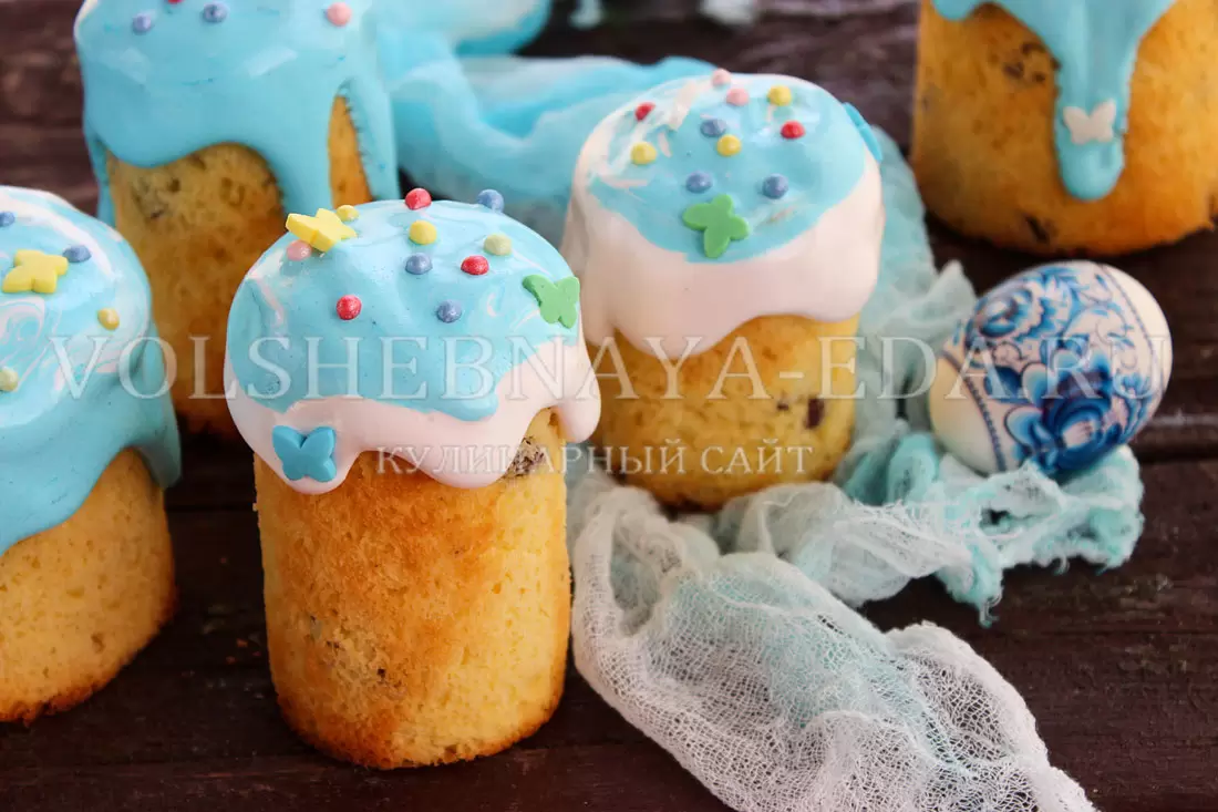 Выпекайте куличи в заранее разогретой духовке при температуре 180 градусов в течение 25-40 минут. По завершении выпечки, куличи рекомендуется охладить и украсить глазурью и посыпками.