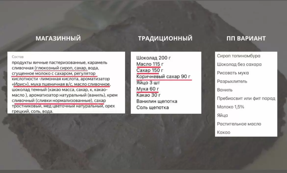 - Магазинный брауни: Наглядный пример продукта с явным избыточным содержанием сахара и химических добавок. Например, состав «брауни с карамелью» включает восемь ингредиентов, среди которых несколько источников сахара, что вызывает вопросы о его питательной ценности.