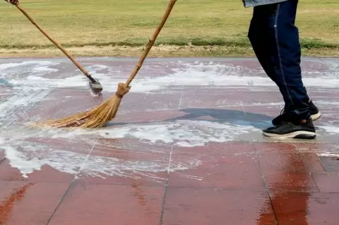 Перед тем как начать уборку, рекомендуется убрать мусор и листья с плитки, а затем смочить поверхность водой. Это поможет минимизировать вред от моющих средств. Для террас из древесного пластикового композита (ДПК) или дерева желательно использовать только специальные чистящие средства, рекомендованные производителем.
