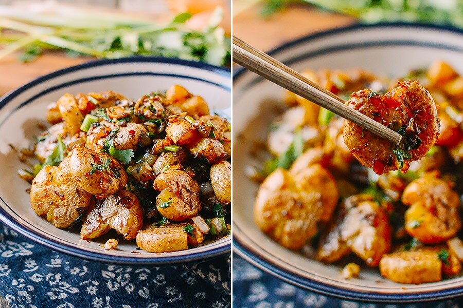 Сначала необходимо хорошенько промыть картофель и залить его водой в кастрюле. Довести до готовности на плите.Слить воду и дать картофелю немного остыть. Каждую картофелину слегка прижать плоским предметом, но не превращать в лепешку.Нарезать зеленый лук и кинзу, а чеснок измельчить. Репчатый лук мелко нарезать кубиками.На среднем огне разогреть столовую ложку растительного масла в сковороде. Выложить картофель в один слой и обжарить с обеих сторон до золотистого цвета. Переложить на тарелку.Добавить в сковороду еще одну столовую ложку масла, семена зиры, чеснок и репчатый лук. Обжаривать, помешивая, около минуты до прозрачности лука.Вернуть картофель в сковороду, добавить соевый соус, сахар, молотую зиру, столовую ложку воды, кунжутное масло и, если хотите, хлопья чили. Осторожно перемешать, чтобы картофель равномерно покрылась специями. Посолить по вкусу.Добавить нарезанные зеленый лук и кинзу. Перемешать и подать к столу. Блюдо готово!Приятного аппетита!