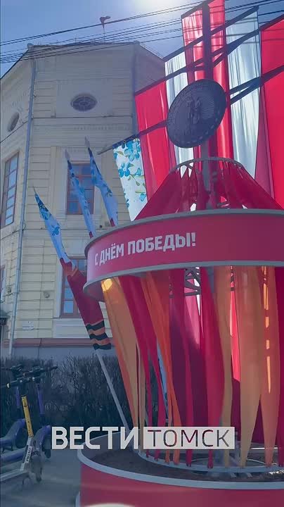 Город постепенно преображается к Дню Победы. На улицах Томска появляются яркие флаги — рабочие монтируют флаговые конструкции на дорогах и в общественных пространствах.
